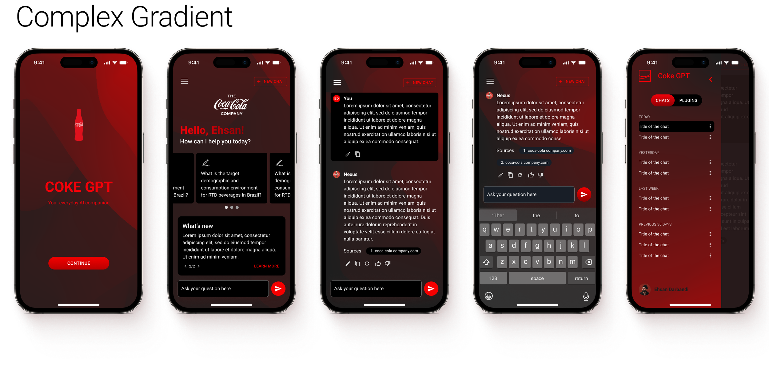 As part of my process, I analyzed leading AI tools such as ChatGPT, Gemini, and Copilot to identify common patterns and user expectations. These products set a clear standard with chat-based interfaces, simple layouts, and guided onboarding that make them easy to use. To help Coca-Cola employees feel comfortable and adopt Nexus AI quickly, I decided to follow these familiar patterns as the foundation. For features that other tools did not cover, like uploading documents for more accurate answers, I created new user flows and wireframes that fit our needs. This approach kept the design intuitive while still adding unique value for Coca-Cola.